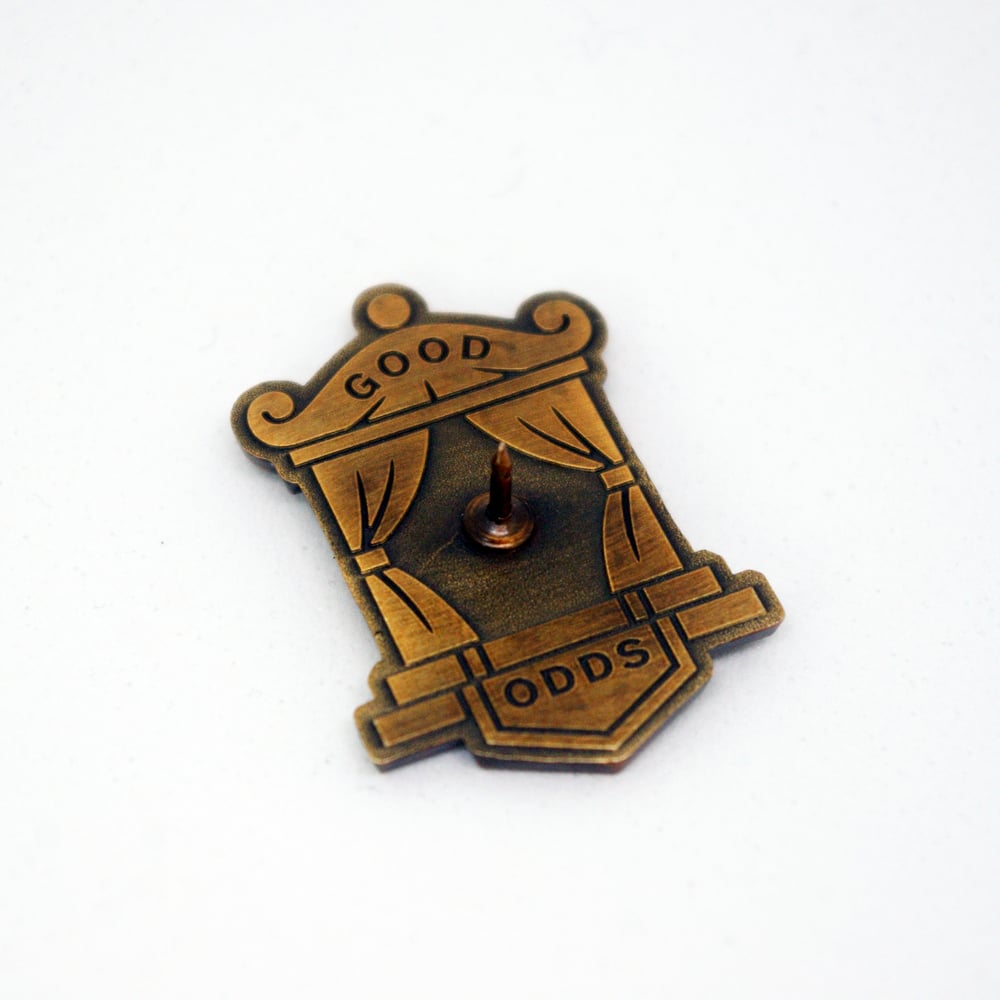 • 25 x 35mm antique-gold soft enamel pin with rubber clasp